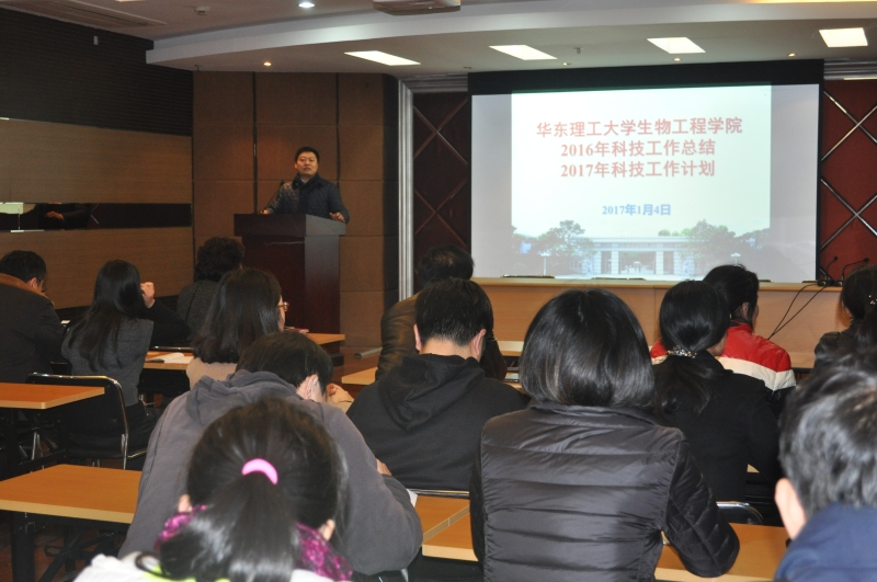 庄英萍院长首先向全院教师介绍了学校2016年的整体科研工作形势,并传达了学校科研工作会议精神,然后详细总结介绍了2016年学院的科研工作举措、取得的科研成果及存在的问题。她指出,学院的基础研究能力和原始创新能力有明显提升,代表性科研成果和科研奖励有了新成绩,在高水平人才引进和培养方面也较往年有明显成效,2016年全院教师齐心协力备战生物反应器工程国家重点实验室迎评估取得了阶段性成果,省部级科研基地又有新收获,但学院到款科研经费形势比2015年有明显下降。在此形势下,学院根据学校的统一部署和要求,制定了2017年学院科研工作计划和任务要求,要求全院教师能够牢牢抓住国家创新驱动力大战略和大形势的有利时机,激发创新活力,充分释放政策红利,为实现学院和学校科研工作目标做出实际贡献。