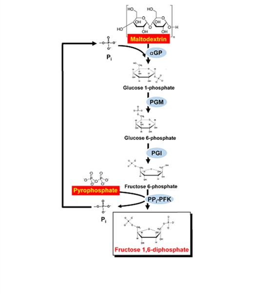 图. Scheme of the ATP-free metabolic pathway for conversion of starch and pyrophosphate to fructose 1,6-diphosphate in vitro. The enzymes arealpha-glucan phosphorylase (αGP), phosphoglucomutase (PGM), phosphoglucose isomerase (PGI) and pyrophosphate-dependent phosphofructokinase (PPi-PFK).
