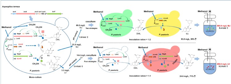 该研究在甲基营养型酵母—毕赤酵母(Pichia pastoris)中异源重构并优化了降血脂药物洛伐他汀、降血脂药物辛伐他汀关键中间体莫纳可林J的生物合成途径,使得以廉价、可再生的甲醇为底物生产大宗或高附加值药用化合物的酵母细胞工厂概念得以实现。同时,为解决复杂异源合成途径引起的遗传及代谢负担,作者针对不同代谢途径节点进行了代谢途径的模块化设计及分配组装,同时采用不同荧光标记装载不同模块的酵母细胞实现菌群精确测量,最终通过多细胞共培养策略在反应器上实现了洛伐他汀及莫纳可林J的高效生物合成。