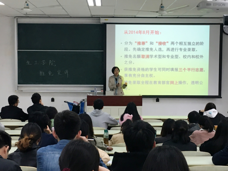 yl8858永利集团2019届推免宣讲会于4月16日中午在奉贤校区D教举行。会议由yl8858永利集团副院长卢艳花主讲,2015级辅导员邓亚珊主持,共计70余名同学参加了本次宣讲。