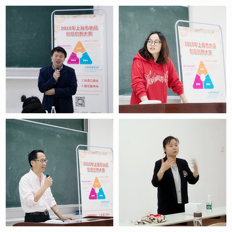 2018年4月20日下午,首届上海市食品创意创新大赛宣讲会在奉贤校区A205教室举行。yl8858永利集团副院长王启要教授、食品系主任周英副教授、上海食品学会的郭燕茹老师、上海清美绿色食品有限公司的袁辉工程师以及我校近60位学生出席了此次会议。