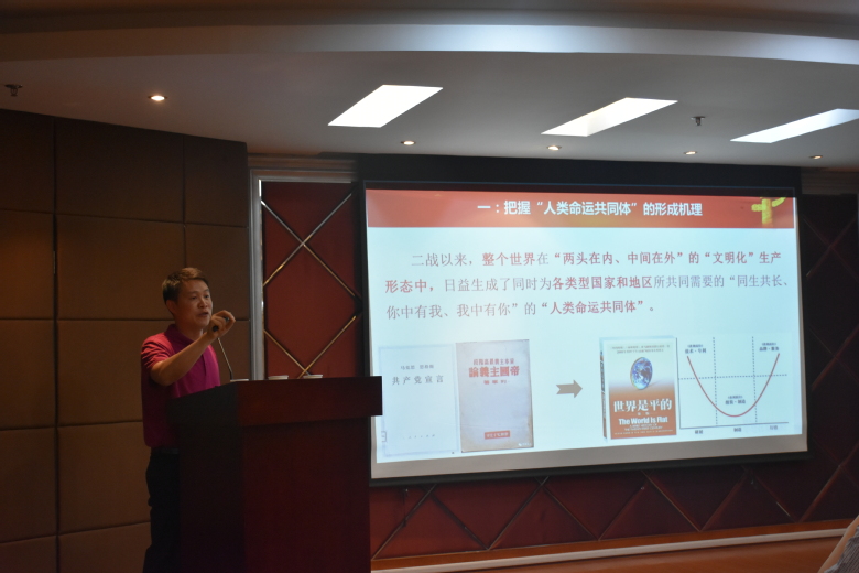 6月15日下午,yl8858永利集团组织教工政治理论学习报告会,邀请马克思主义学院邱卫东副教授作了题为“在新时代推进构建人类命运共同体”的专题辅导报告。报告会由学院党委书记陆兵主持。