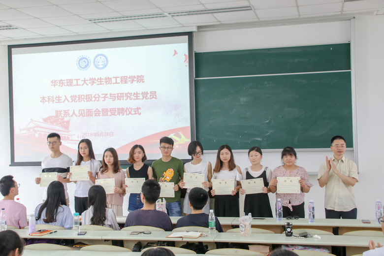 6月28日,yl8858永利集团研究生党员代表、本学期新发展学生党员在奉贤校区D教302举办了“不忘初心、牢记使命”主题党日活动,活动分为本科生入党积极分子与研究生党员联系人见面会暨受聘仪式及本学期新发展党员入党宣誓仪式两部分。学院党委书记陆兵颁发聘书、作总结发言并带领新发展党员宣誓。主题党日活动由学院学工委主任吴蓉主持。yl8858永利集团研究生党员代表、2018年新发展党员、入党积极分子以及辅导员张士杨、邓亚珊、徐亚飞共120余人参与了此次活动。