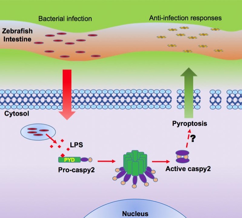 炎症小体(inflammasomes) 是一种由细胞浆内天然免疫识别受体参与组装的多蛋白复合物,其激活在应答危险信号并促进白介素IL-1β和IL-18分泌过程中扮演了重要作用。在哺乳动物中,经典炎症小体和非经典炎症小体分别通过激活caspase-1和caspase-11,触发一种特殊的细胞死亡模式——pyroptosis,进而抵御感染。近年来,不断有研究证实细胞炎性坏死或细胞焦亡是一种机体在感知病原微生物浸染后启动的免疫防御反应,在拮抗和清除病原感染以及内源危险信号中发挥重要作用。但是,在鱼类等低等脊椎动物中是否也存在炎症小体,其如何介导抗感染免疫效应的分子机制仍然是一个具有挑战的课题。