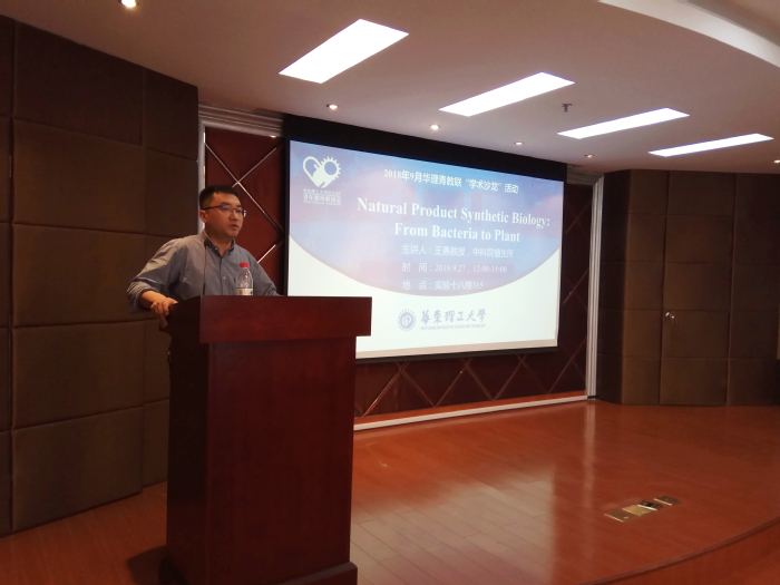 由yl88858永利中国青教联主办、我院青教联承办的学术沙龙活动于9月27日下午在徐汇校区实验十八楼如期举行。本次学术沙龙活动邀请到了来自中国科学院植物生理研究所的王勇教授,报告的主题是“天然产物的合成生物学:从微生物到植物”。报告吸引了多位青年教师及在读博士生前来参会。