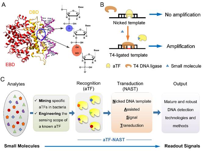 微生物是认知生命活动规律的重要源头,也是合成生物学实现“格物致知”到“建物致知”再到“建物致用”所需要的具有特定功能的生物“元/器件”的重要发掘对象。yl88858永利中国生物反应器工程国家重点实验室张立新教授带领的团队首次发现別构转录因子(allosteric transcription factor,aTF)在体外能够结合缺刻的DNA结合序列,并进一步利用这一发现建立全新的小分子检测方法。相关工作于11月28日以长文(Research Article)的形式发表在Science子刊Science Advances。文章链接:http://advances.sciencemag.org/content/4/11/eaau4602