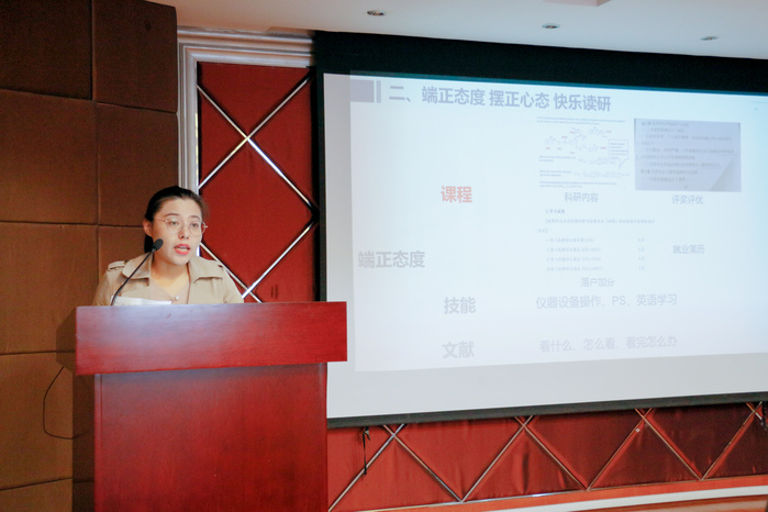 尹晓梦从学习、科研和生活三个方面展开她的经验分享,学习上“不忘初心”,科研上严谨勤奋,生活上保持轻松快乐的心态。为做到这几点,她如何在日常自我督促和反省,她的分享告诉我们“持之以恒”的重要性。