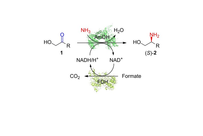 手性邻位氨基醇在生物活性分子中广泛存在,也是一类重要的药物结构砌块,例如抗结核病药物乙胺丁醇(Ethambutol)、抗艾滋病药物埃替格韦(Elvitegravir)等药物分子中都含有此类结构砌块。化学法合成手性的邻位氨基醇存在反应条件苛刻、选择性不高等问题。胺脱氢酶可以利用氨分子作为氨基供体催化羰基直接还原胺化生成相应的手性胺,被认为是一种有前景的手性胺绿色合成途径,但还未见将其用于催化α-羟基酮的不对称还原胺化制备手性氨基醇的研究报道。
