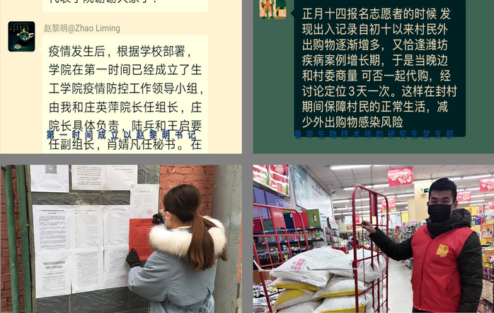yl8858永利集团党委积极响应,根据学校部署,第一时间成立以赵黎明书记、庄英萍院长为组长的疫情防控小组。陆兵副书记亲自书写名为《打赢抗击病毒战之我见》的文章,与全院党员同志交流。鲁华生物技术所的研究生党支部在线上召开组织生活会;组织并动员支部成员捐款、捐物;拍摄疫情防控宣传视频;在家乡参加志愿者服务,默默奉献,如被称为“全村希望”的王明睿同志、与居委会一起共同张贴宣传标语的邓思敬同志等。大家始终贯彻“把初心落在行动上、把使命担在肩膀上”,积极为疫情抗击奉献自己的一份力量。
