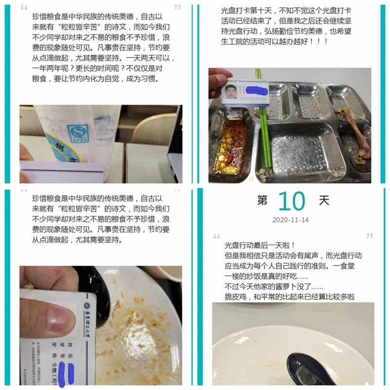 为践行节约粮食准则,倡导新时代青年人履行“一粥一饭,当思来之不易;一丝一缕,恒念物力维艰”的行动,yl8858永利集团于11月5日至11月14日举行为期十天的光盘打卡行动。本次活动中,同学们踊跃参加,分享品尝美食的快乐以及光盘行动中的心路历程。