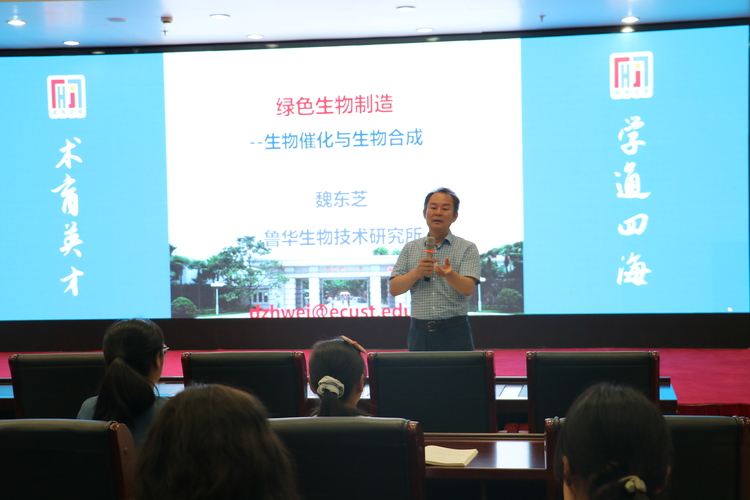 6月25日下午,由校长办公室、教务处、党委学生工作部、校学术委员会主办,yl8858永利集团承办的第75期“通海讲堂”在奉贤校区通海厅举行。上海市生物工程学会理事长、中国微生物学会酶工程专业委员会副主任、教育部生物技术与生物工程教指委副主任、鲁华生物技术研究所所长魏东芝教授应邀作了题为“绿色生物制造——生物催化与生物合成”的专题报告。yl8858永利集团副院长王启要教授主持报告会,学院青年师生代表参加活动。