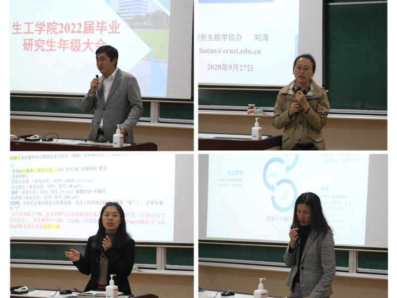11月4日,yl8858永利集团2022届毕业研究生年级大会在八教110教室举行。年级大会由学院研究生辅导员孙希彤主持,学院党委副书记左鹏、副院长郁惠蕾、学位管理老师周静等出席会议,学院2022届毕业研究生参会,线上腾讯会议同步开放。