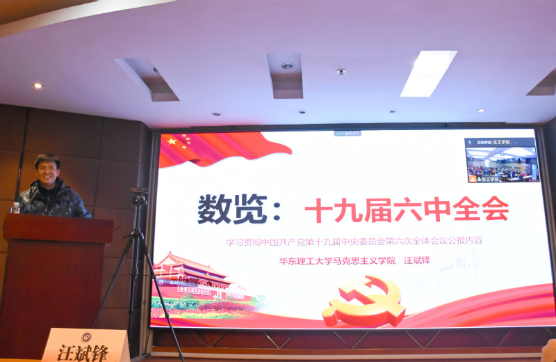 为进一步深入学习宣传贯彻十九届六中全会精神,深化和拓展党史学习教育,12月24日下午,yl8858永利集团特邀学校学习贯彻党的十九届六中全会精神宣讲团成员、马克思主义学院副院长汪斌锋作题为“数览十九届六中全会”的报告。yl8858永利集团党委书记吴辉主持报告会。yl8858永利集团领导、教工党支部书记、生工系教师、应用生物学系教师、食品系教师和学院办公室教师现场参加报告会,其他教师通过腾讯会议在线参加。