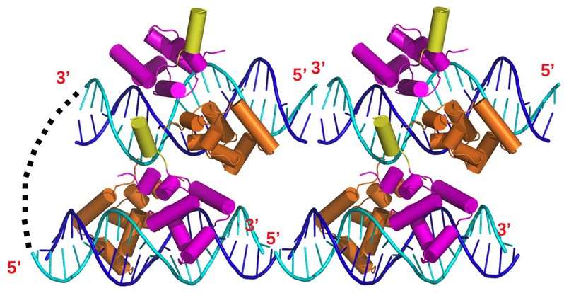 图片说明:EnrR通过其C-端与DNA大沟和N-末端与临近DNA链小沟结合