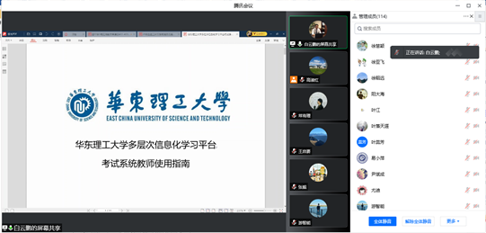 随后,白云鹏详细讲解了在线考试平台的使用。他从题库管理、试卷管理、发布考试、考试管理与监考等方面进行了具体的介绍和操作演示。与会教师就试卷组卷、防范作弊、考试网络带宽保障等方面提出问题,白云鹏一一进行解答。本次学习活动切合当前疫情防控下的在线教学要求,教师们纷纷表示,这次学习非常及时,为本学期组织线上考试提供了非常详细的指导。