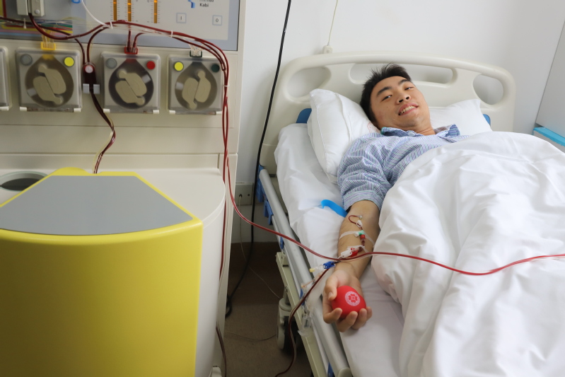 上午9时,在华山医院的血液科病床上,韩宇辰正在进行造血干细胞捐献,手臂上扎着输液管,平躺在病床上,暗红的静脉血液通过输液管进入到右侧的血细胞分离机,与190ml造血干细胞悬液一起献出的,还有韩宇辰阳光般灿烂的笑容。