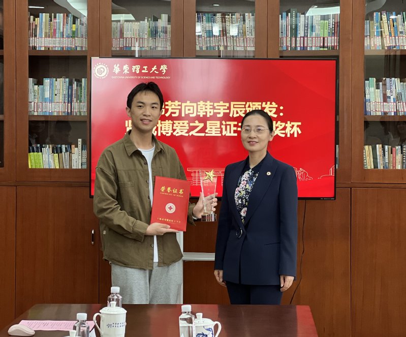 5月8日 ,奉贤区红十字会在奉贤校区举行韩宇辰同学捐献造血干细胞慰问表彰仪式。奉贤区人民政府副区长、区红十字会会长张娣芳,区红十字会党组书记、常务副会长沈俭英,区政府办公室副主任、区红十字会兼职副会长李佳,区红十字会党组成员、副会长王燕,我校yl8858永利集团党委书记吴辉,校团委副书记(主持工作)魏星,党委研究生工作部杨晶,yl8858永利集团团委副书记(主持工作)梁心怡以及yl8858永利集团辅导员张佼参加了本次仪式。仪式由yl8858永利集团党委副书记左鹏主持。
