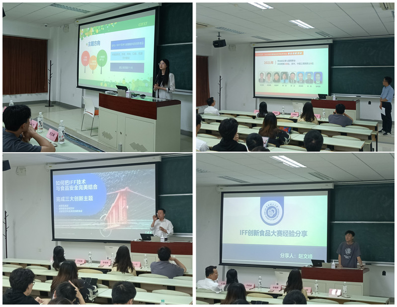 但晓雅代表中国食品科学技术学会向师生介绍了此次创新大赛的比赛规则、主题方向、参赛队伍组成、方案书写、参赛日程、奖励以及往年优秀产品展示等,随后向师生们播放了本次大赛的宣讲视频。李晴辉从IFF的发展历程、业务范围以及IFF在此次大赛中为参赛学生提供的配料、方案实施帮助等方面做了详尽的介绍。赵文峰针对选题、计划书撰写、包装制作、计划书修改和视频制作等方面向同学们分享参赛经验。