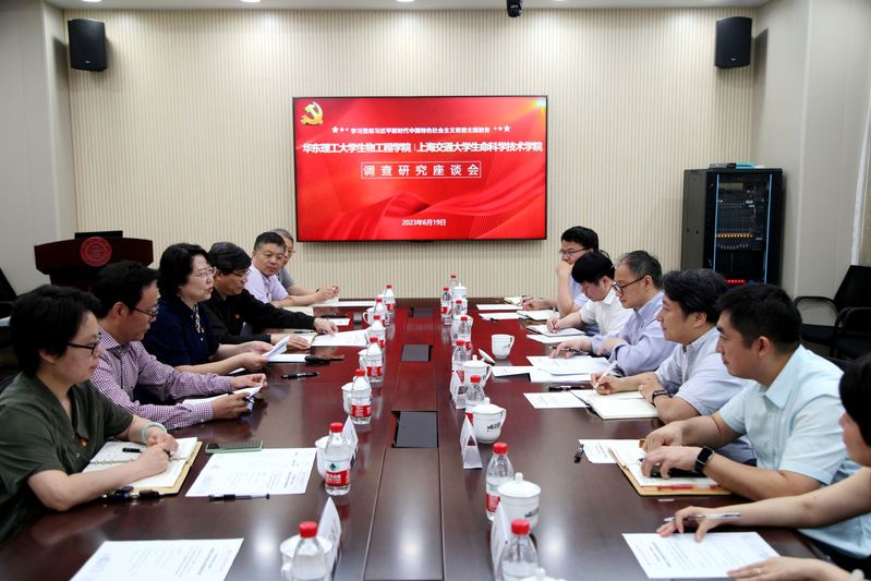 为深入开展学习贯彻习近平新时代中国特色社会主义思想主题教育走深走实,推动党建与事业发展深度融合,6月19日,yl8858永利集团院长叶邦策、党委书记吴辉、党委副书记左鹏和副院长王启要、刘琴、郑高伟及党政办公室相关同志赴上海交通大学生命科学技术学院调研。上海交通大学生命科学与技术学院院长冯雁、党委书记顾建平、党委副书记王鑫和副院长李志勇、张晓君及相关同志参加调研座谈。调研座谈会由冯雁主持。