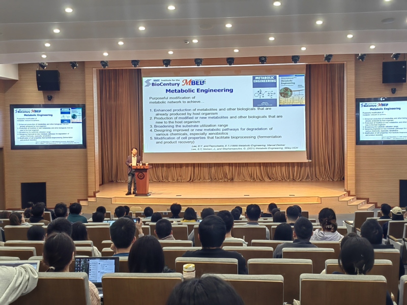 Sang Yup Lee是国际合成生物技术领域的顶尖科学家,开创了系统代谢工程,开发了很多微生物细胞工厂,实现了一系列大宗化学品和材料的生物制造。报告中,Sang Yup Lee系统介绍了微生物细胞工厂发展的系统代谢工程策略,展示了多种产品的生物基生产,包括塑料、塑料单体、燃料和天然产品。报告深入浅出、内容详尽,他用生动的语言和丰富的案例与听众们分享了一场奇妙的科研之旅,展示了系统代谢工程在引领产业变革、支撑经济社会可持续发展方面的重大驱动作用,为我校师生开展教学与科研提供了有益指导。提问环节时,在场师生与Sang Yup Lee进行了积极的互动交流。