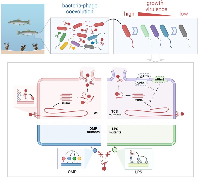 基于上述研究背景,本研究以重要的海洋病原菌杀鲑气单胞菌为研究对象,解析了其中不同的噬菌体抗性模式以及它们在时间尺度上如何驱动细菌的适应性变化。本研究鉴定了11个噬菌体抗性基因并按其功能分为三类:脂多糖 (LPS),外膜蛋白 (OMP) 和双组分系统(TCS)。在细菌与噬菌体的长期共进化实验中,研究人员发现,LPS和OMP的共突变是细菌抵抗噬菌体的主要方式,并且由于其低抗性代价它们在共进化中被保留。同时,研究人员首次发现细菌通过TCS抑制噬菌体转录而导致了不完全噬菌体抗性,但是难以在共进化中被富集。通过对细菌群落的表征,研究发现:细菌在抵抗噬菌体初期的生长和毒力快速下降,表现为军备竞赛动态;随后趋于稳定,表现为波动选择动态。本研究的发现解析了共进化中海洋细菌群落动态变化过程和噬菌体抗性的进化权衡问题,有助于进一步在时间尺度上了解海洋微生物的相互作用,也为海洋病原菌的噬菌体治疗提供了理论支持。