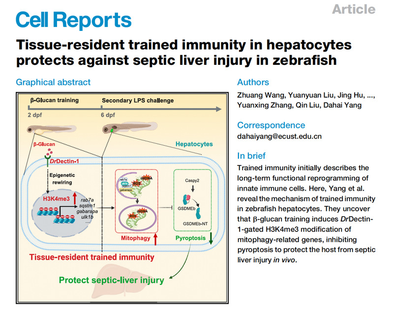 近日,Cell子刊 Cell Reports 以“Tissue-resident trained immunity in hepatocytes protects against septic liver injury in zebrafish”为题,在线报道了我校生物反应器工程国家重点实验室阳大海教授课题组在鱼类训练免疫激活缓解感染性肝损伤发生分子机制方面的最新研究成果。
