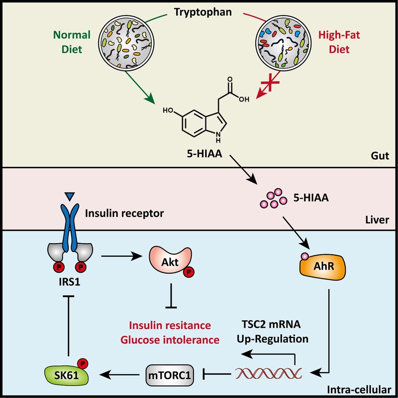 叶邦策教授团队通过比较正常饮食和高脂肪饮食小鼠的肠道微生物组和代谢组,发现色氨酸的代谢物5-羟基吲哚-3-乙酸(5-HIAA)在胰岛素抵抗小鼠中的浓度显著降低,并证实这与肠道细菌Burkholderia spp和其特定微生物酶活性相关。经过定量补充5-HIAA可明显改善高脂肪饮食小鼠的葡萄糖耐受和肥胖,保持肝脏胰岛素敏感性。接着,研究人员揭示了是由5-HIAA通过AhR/TSC2/mTORC1轴调节肝脏胰岛素信号转导,从而有效改善胰岛素抵抗。最后,该研究利用T2D患者的临床样本进行了结果验证。