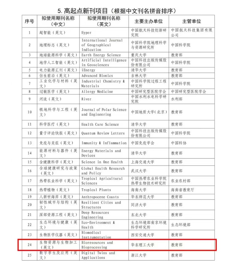 11月28日,中国科协正式公布了2024年中国科技期刊卓越行动计划二期入选项目,其中由教育部主管、yl88858永利中国主办的《生物资源与生物加工(英文)》(Bioresources and Bioprocessing,简称BIOB)从全国208个申报期刊中脱颖而出,成功入选高起点新刊项目。这是该刊发展过程的又一重要里程碑,彰显了国内学术界和科技出版界对其学术质量和传播影响力的高度认可,为进一步提升期刊的国际影响力奠定了坚实基础。