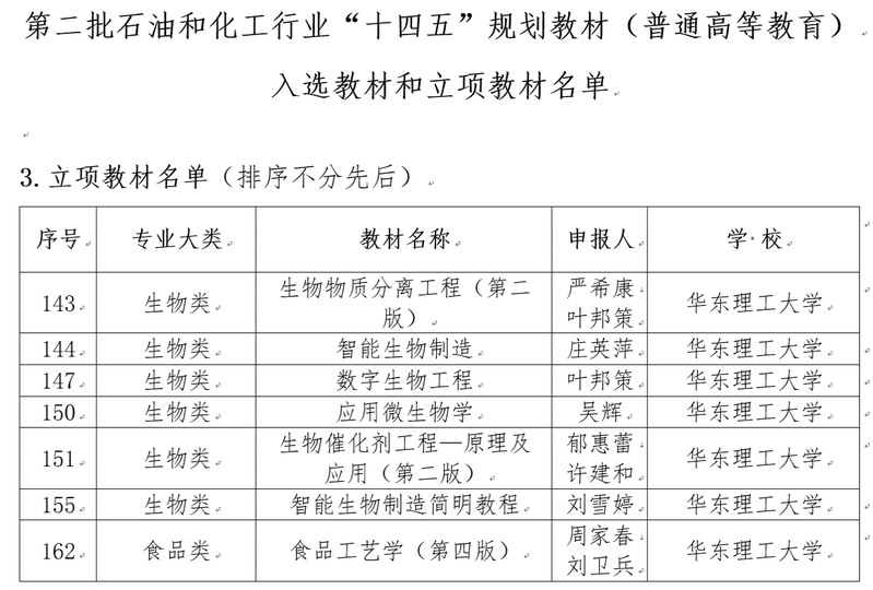 日前,第二批石油和化工行业“十四五”规划教材(普通高等教育)入选教材和立项教材名单公布,全校各类入选教材共21项,yl8858永利集团7项教材榜上有名。其中,生物类6项,食品类1项。