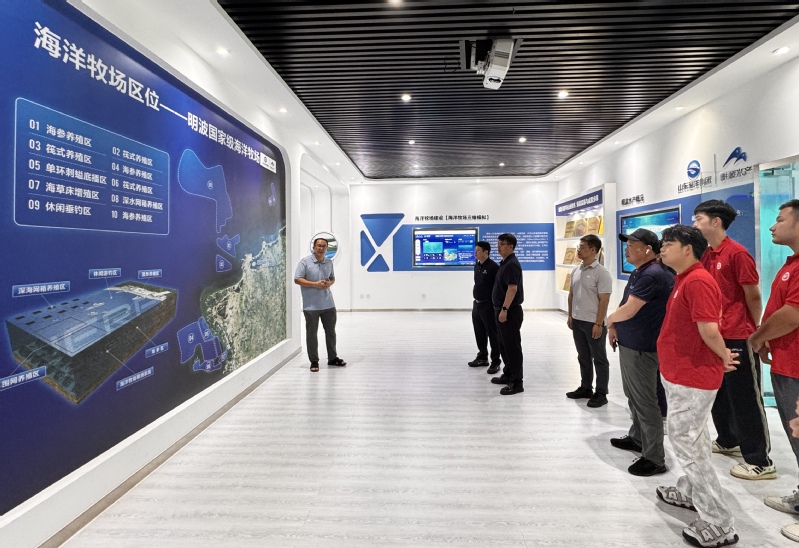 实践团首站走进莱州明波水产有限公司。在企业展厅,国家级海洋牧场三维动态模型生动呈现了“创新引领、责任担当”的现代化渔业图景。通过物联网监控大屏,实践团实时观测亲鱼车间养殖数据流,了解企业以智慧育苗和生态修复为核心的双轨战略。在“蓝钻一号”大型生态围栏模型前,团队成员深入了解科技如何推动“养殖-放流-捕捞”可持续闭环,筑牢蓝色粮仓根基。