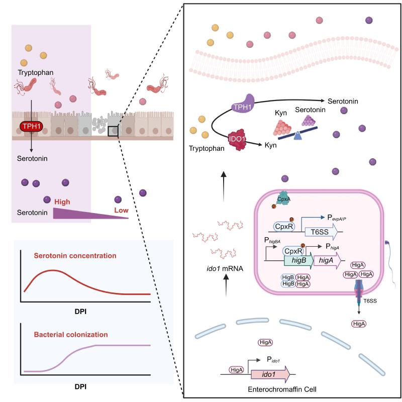 图片说明:VI型效应蛋白 (T6SS) HigA调控宿主肠道血清素水平模式图