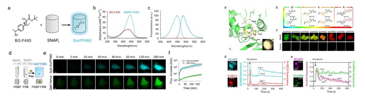 --------------------------------------------------------------------------------------------------------------------------------------------------- Design of a palette of SNAP-tag mimics of fluorescent proteins and their use as cell reporters 荧光蛋白为生物学各个领域的研究做出了极大的贡献,但其性能仍有不足。我们基于化学生物学及合成生物学原理进化设计出了一系列光谱覆盖蓝色到近红外波段的人造荧光蛋白。该系列人造荧光蛋白均具有信噪比高的特点,其在近红外波段的亮度远超已有成像工具,能够对活细胞和活体动物体内的蛋白质表达、蛋白质降解、蛋白质组装以及蛋白质运输实现实时成像。我们在此基础上设计开发出一系列光谱涵盖青色到近红外波段的钙离子荧光探针,并初步实现了对哺乳动物细胞中钙离子震荡的实时监测,为荧光探针的构建提供了新的工具。(Cell Discov 2023, 9, 56)