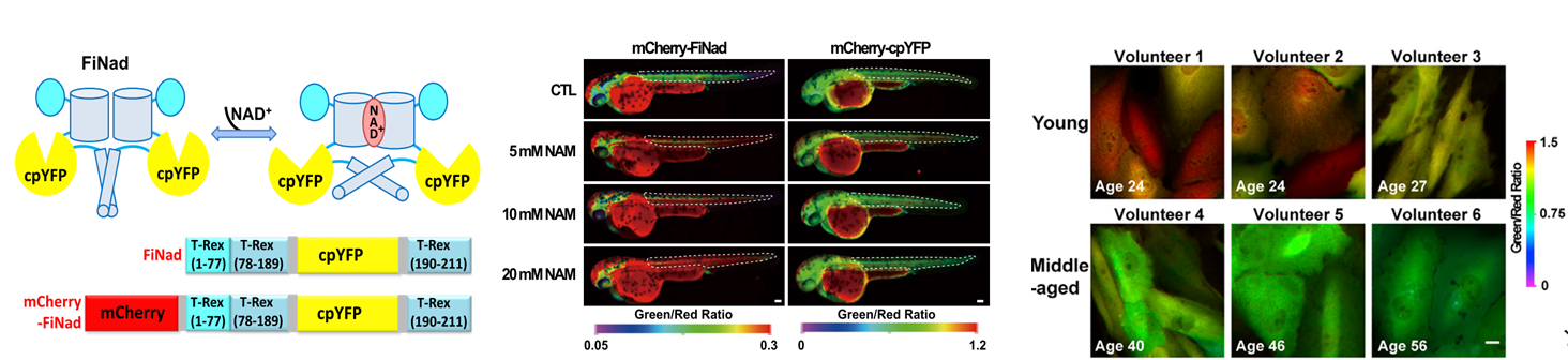 --------------------------------------------------------------------------------------------------------------------------------------------------- Illuminating NAD+ Metabolism in Live Cells and In Vivo Using FiNad sensor  FiNad是一个高响应、高灵敏、大动态范围检测NAD+/AXP比率的遗传编码荧光探针,实现了细菌、酵母、哺乳动物细胞、斑马鱼和活体小水平NAD+成像。,可用于细胞信号转导、细胞代谢、衰老等领域研究(Developmental Cell, 2020)